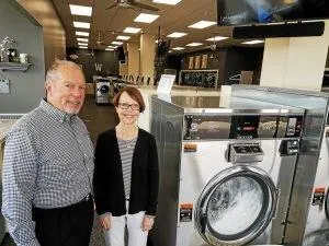 WashStop Laundry Center owners Barrett and Janet Van Damestand next to new washing machines in their recently reopened laundromat.
